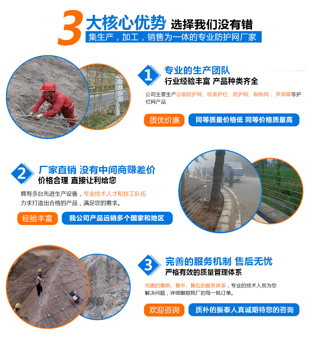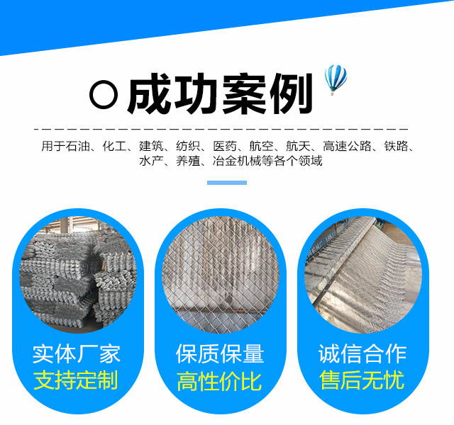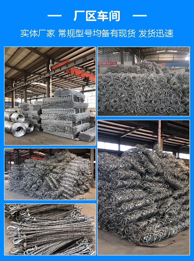 主要生产产品有:边坡防护网、缆索护栏、防护网、蜘蛛网 、声屏障等金属丝网产品. 主要用于石油、化工、建筑、纺织、医药、航空、航天、高速公路、铁路、园林防护、水产、养殖、冶金机械等各个领域。