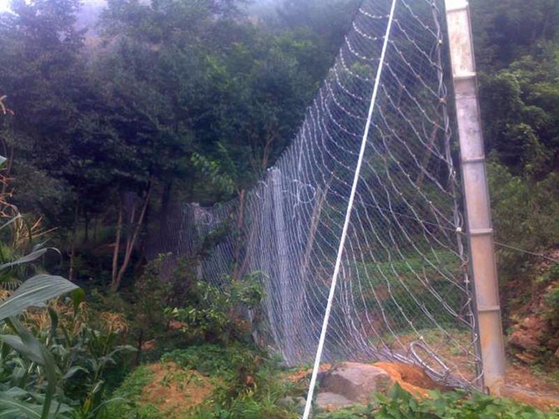 利用钢柱和钢绳支撑柔性网形成护栏形式的落石隔离栅,将滑坡的落石栏截在其防护围栏外防止其对建筑造成破坏。被动防护点:防护能力强一般可拦截1000kg以上落石。山体滑坡防护网中的钢丝绳网被动防护系统的特点:系统的柔性和拦截强度足以吸收和分散传递预计的落石冲击功能,消能环的设计和采用使系统的抗冲击能力得到进一步提高。与钢性拦截和砌砖挡墙相比,改变了原有施工工艺,使工期和资金得到减少。