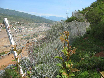 RXI-150被动防护网网型为:R123300;有上下两条支撑绳,支撑绳的直径为22mm,上拉锚绳与侧拉锚绳直径为18mm,形成八字形。
